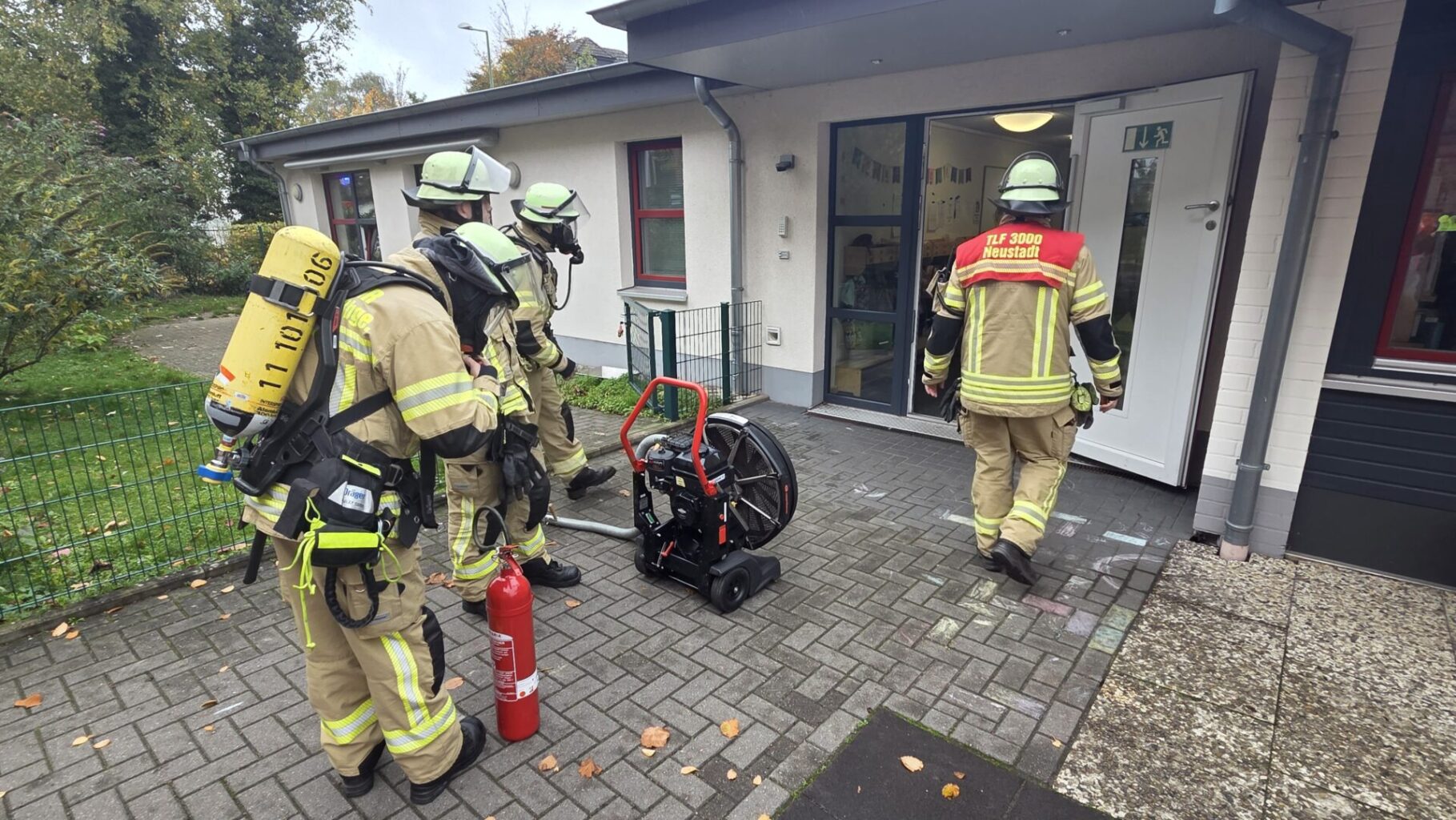 Neustadt – Alarm in Kita – Entstehungsbrand schnell gelöscht, Kinder in Sicherheit. Feuerwehr und Rettungsdienst im Einsatz.