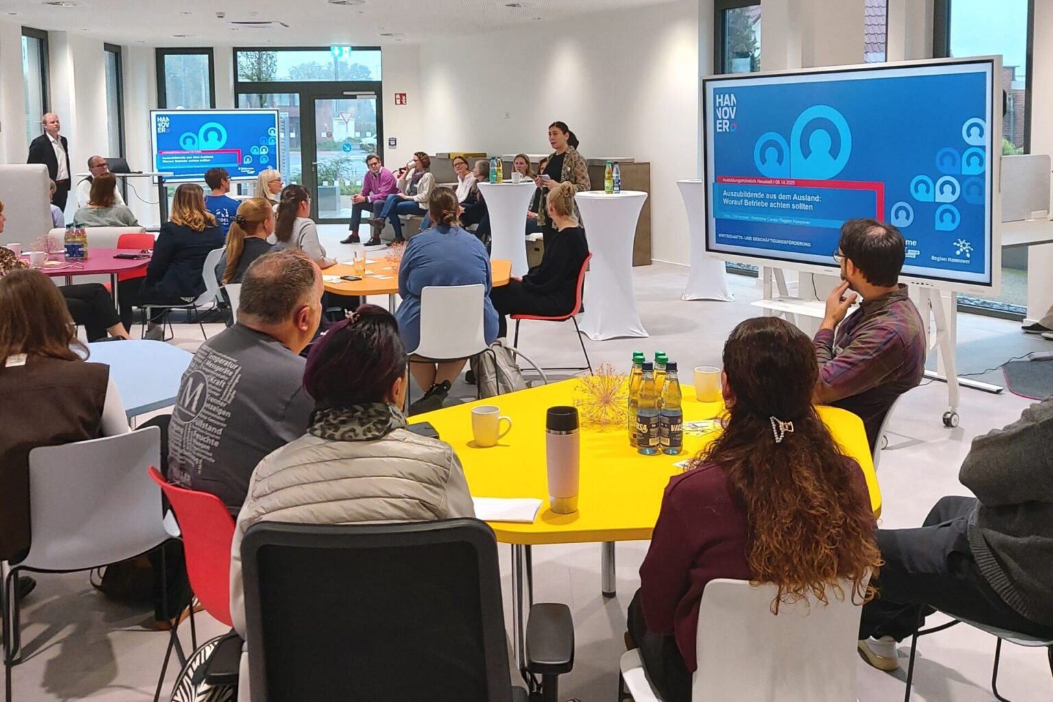 Anschließend zeigte Tatia Chkhenkeli von der Region Hannover die Unterstützungsmöglichkeiten bei der Gewinnung von Auszubildenden aus dem Ausland auf. Sie erläuterte die Punkte, auf die geachtet werden sollte, wenn sich ein Betrieb hiermit beschäftigt. Beispielsweise sollten die Unternehmen mindestens ein halbes Jahr beim Visumsverfahren einplanen. Berichte aus dem Teilnehmerkreis zeigten unterschiedliche Erfahrungen bei der Gewinnung von Fachkräften aus dem Ausland und auch bei der Integration von Geflüchteten auf. Mitunter wurden lange Bearbeitungszyklen bei der Ausländerbehörde genannt.
