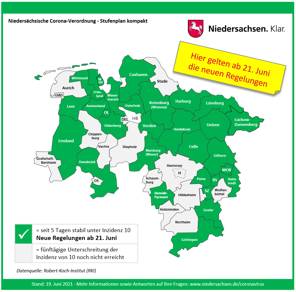Neustadt/Niedersachsen – Die Landesregierung hat erneut die niedersächsische Corona-Verordnung aktualisiert. Heute treten wesentliche Lockerungen für Inzidenzen unter 10 in Kraft – (Stufe null). Vollständig tritt diese aber in der Region Hannover erst bei einer stabilen Inzidenz unter 10 in Kraft.
