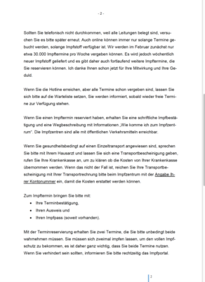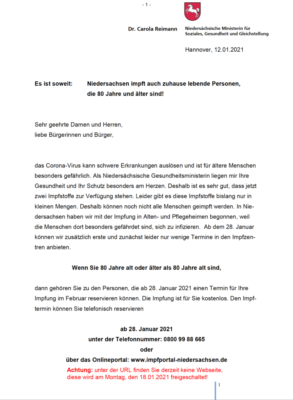 Das Schreiben enthält im Wesentlichen die Information, dass die ersten Termine in den 50 Impfzentren im Land Niedersachsen ab dem 28. Januar 2021 unter der Telefonnummer 0800 99 88 665 oder über das Onlineportal www.impfportal-niedersachsen.de vergeben werden. Diese Webseite wird am kommenden Montag, den 18. Januar, zunächst mit allgemeinen Informationen zur Covid-Impfung online gehen, das Portal zur Terminvergabe öffnet dann am 28. Januar.