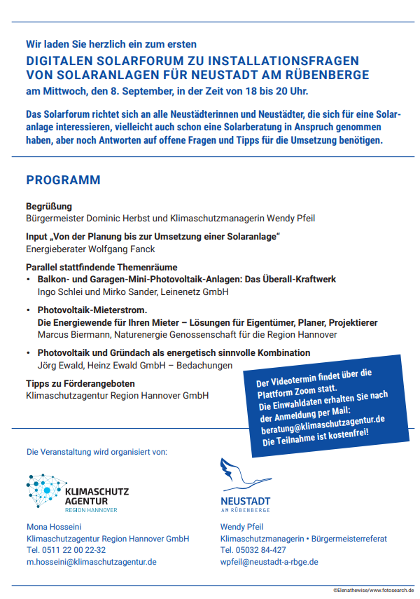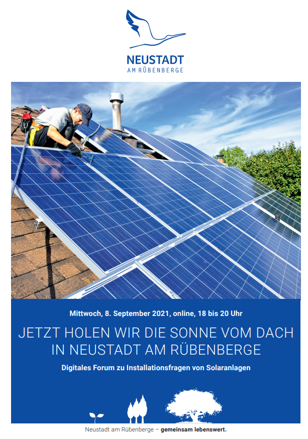 Neustadt- Für alle, die eine Solaranlage auf dem eigenen Dach planen, bietet die Klimaschutzagentur Region Hannover ein digitales Forum zu Installationsfragen von Solartechnik an. Die Veranstaltung findet im Rahmen der Solaroffensive der Region Hannover am Mittwoch, 8. September, um 18 Uhr in Zusammenarbeit mit dem Klimaschutzmanagement von Neustadt am Rübenberge statt.