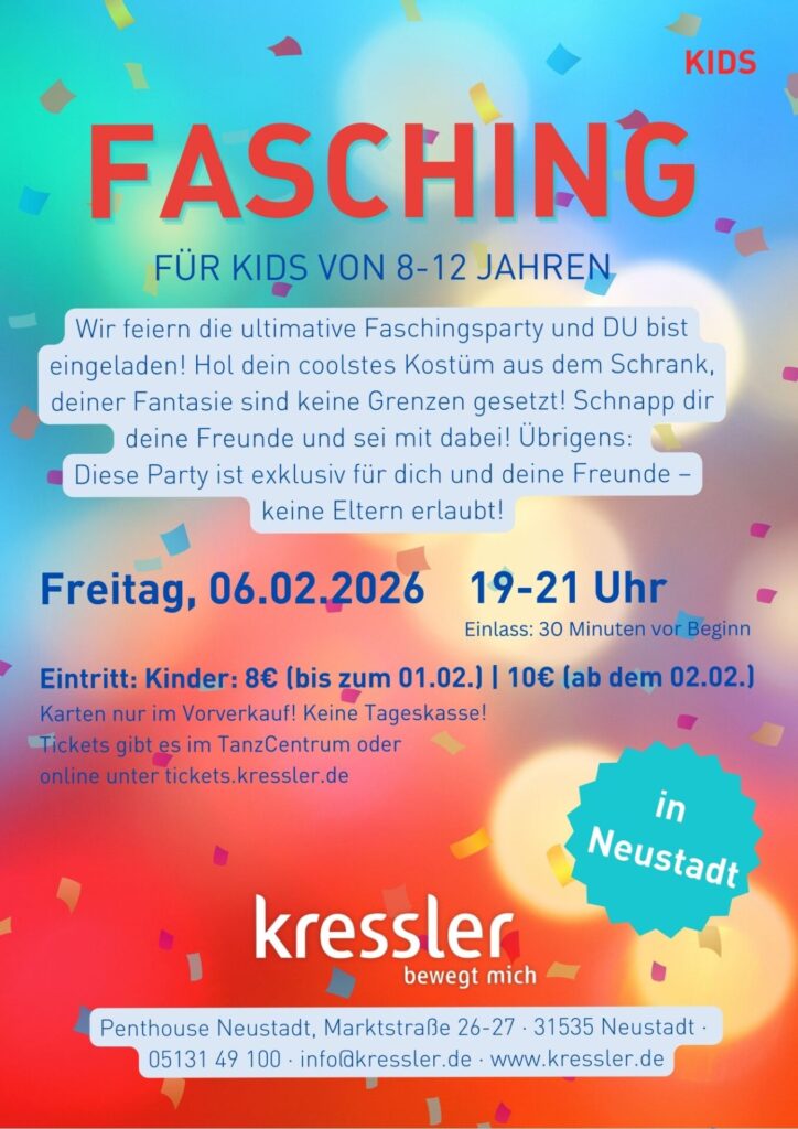 Am 06. Februar 2026 findet im Penthouse Neustadt eine aufregende Faschingsparty für Kinder im Alter von 8 bis 12 Jahren statt. Die Veranstaltung verspricht eine unvergessliche Zeit mit vielen Aktionen, Spielen und den angesagtesten Tänzen. Die jungen Gäste sind eingeladen, in ihren kreativsten Kostümen zu erscheinen und als ihre Lieblings-Pop- oder Filmstars zu feiern. Eltern haben keinen Zutritt.
