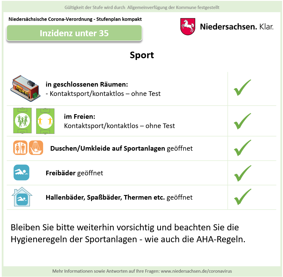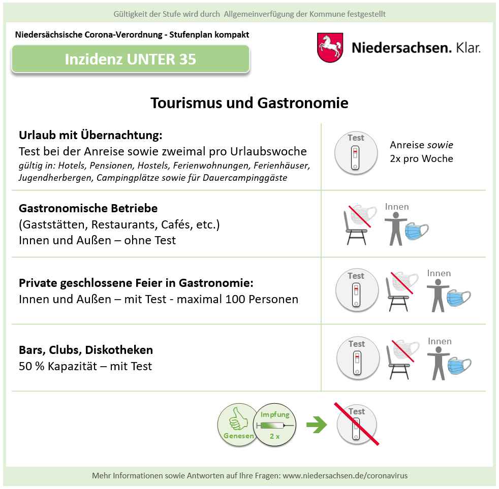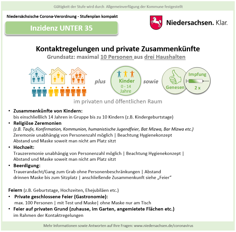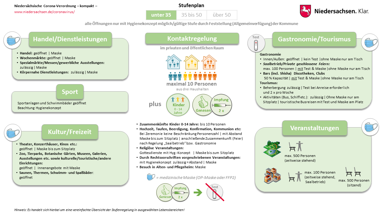 Hier die Grafiken des Landes Niedersachsen zur vereinfachten Darstellung der Corona-Regeln bei einer Inzidenz 10-35, für Details klicken Sie bitte hier Verfügung Region Hannover.