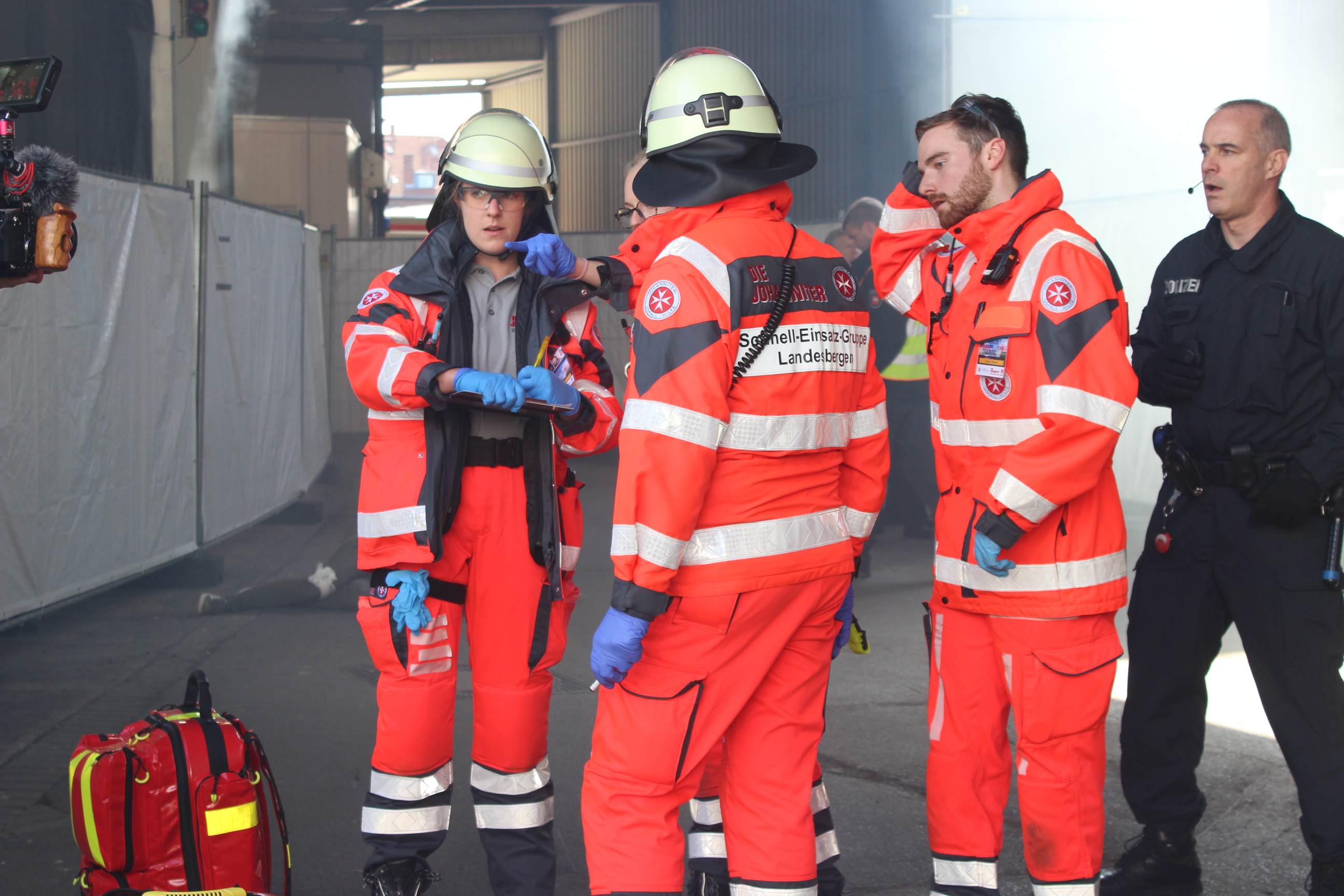 Als erstes kommen Polizisten und sichern den Ort des Geschehens. Dann folgen Sanitäter der Johanniter-Unfall-Hilfe (JUH), um die Verletzten zu behandeln.