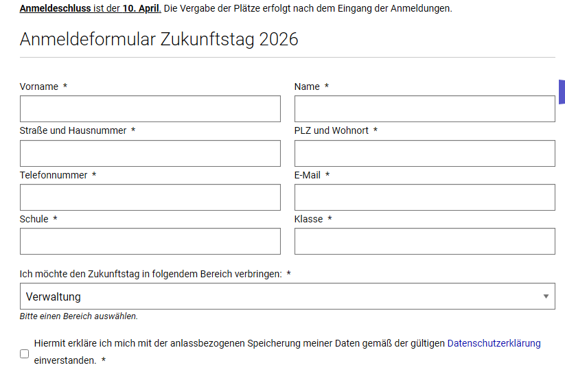 Anmeldeschluss für den diesjährigen Zukunftstag ist der 10. April. Die Plätze begrenzt sind und erfahrungsgemäß besteht eine hohe Nachfrage.